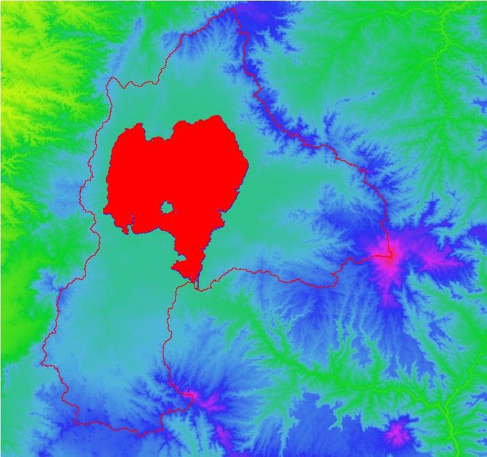 The lake polygon will be displayed over the DEM as shown below.