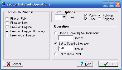Select DEM Conditioning >> Vector Dataset Operations. As we only want to modify pixels underling the lake polygon boundary, ensure that 'Pixels on Polygon Boundary' is selected. We want to set all pixels underlying the polygon boundary to an elevation of 1786, so select the 'Set to Specific Elevation' radio button and enter 1786 (the form should look similar to that shown below). Click OK and when prompted select the 'combined_lake.mif' file and click 'Open'.