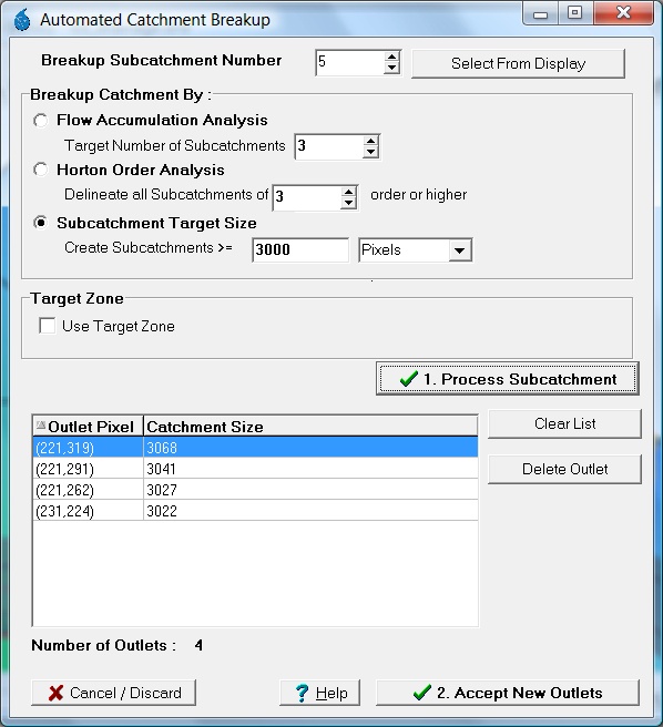 We can see that on of the catchments is very large and more pits will be needed in this area. CatchmentSIM can help with this by automatically placing outlets to create subcatchments of similar user designated sizes. For example, go to the Subcatchment Breakup form (Subcatchments >> Breakup Subcatchment). Ensure the correct subcatchment is selected, click on Select From Display and click on the largest subcatchment. Select the Subcatchment Target Size option and enter 3000 pixels (in this example = 3000 m2). Select 'Process Subcatchment'. Next select 'Accept New Outlets' and click 'yes' to refine the subcatchment.