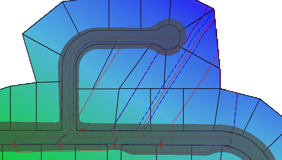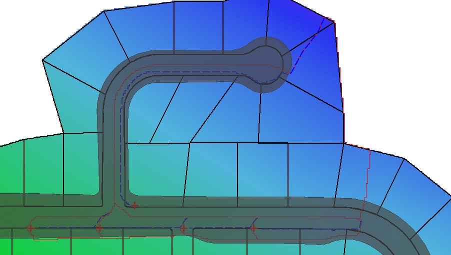 The images shown above indicate that subcatchments have only been mapped for the roadways. This is because DEM elevations have not been assigned to areas outside of the roadway. This methodology is suitable if drainage infrastructure is already in place to drain areas external to the roadway. However, what happens if the stormwater drainage system in the roadway needs to be designed to cater for runoff originating from outside of the roadway?