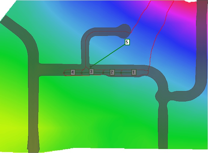 At this stage your DEM should be ready for use in mapping subcatchment boundaries. To test flow routing on the DEM try mapping flow from a selection of pixels within the roadway. Do this by selecting Flow Mapping >> Map Pixel Flow Path and clicking on some points on the screen that you expect to drain to each of the stormwater pits.