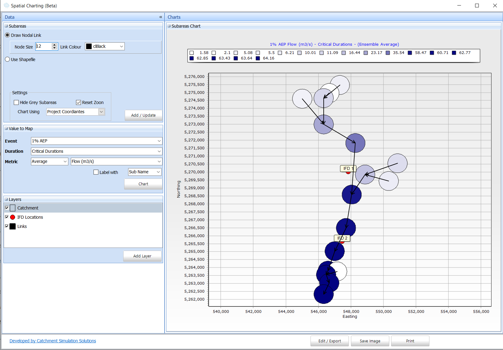 Subareas that can not be matched to results or are not selected in the Refine Subcatchments results filter will be shown in grey and can be hidden from the display using the 'Hide Grey Subareas' checkbox. The 'Reset Zoom' checkbox determines if the map will be zoomed out and aspect ratio fixed at 1:1 on clicking the Add/Update button. If you would like to chart different results while being zoomed in, uncheck this option. The map can be zoomed by clicknig and draging on the map. Individual layers in the map can be turned on/off and reordered in the Layers panel and further options including line widths and labelling are available by right click. Additional shapefile layers can be added to the display for visual purposes such as streams using the Add Layer button.