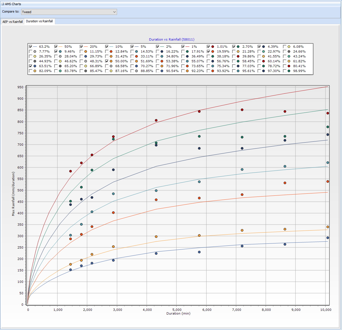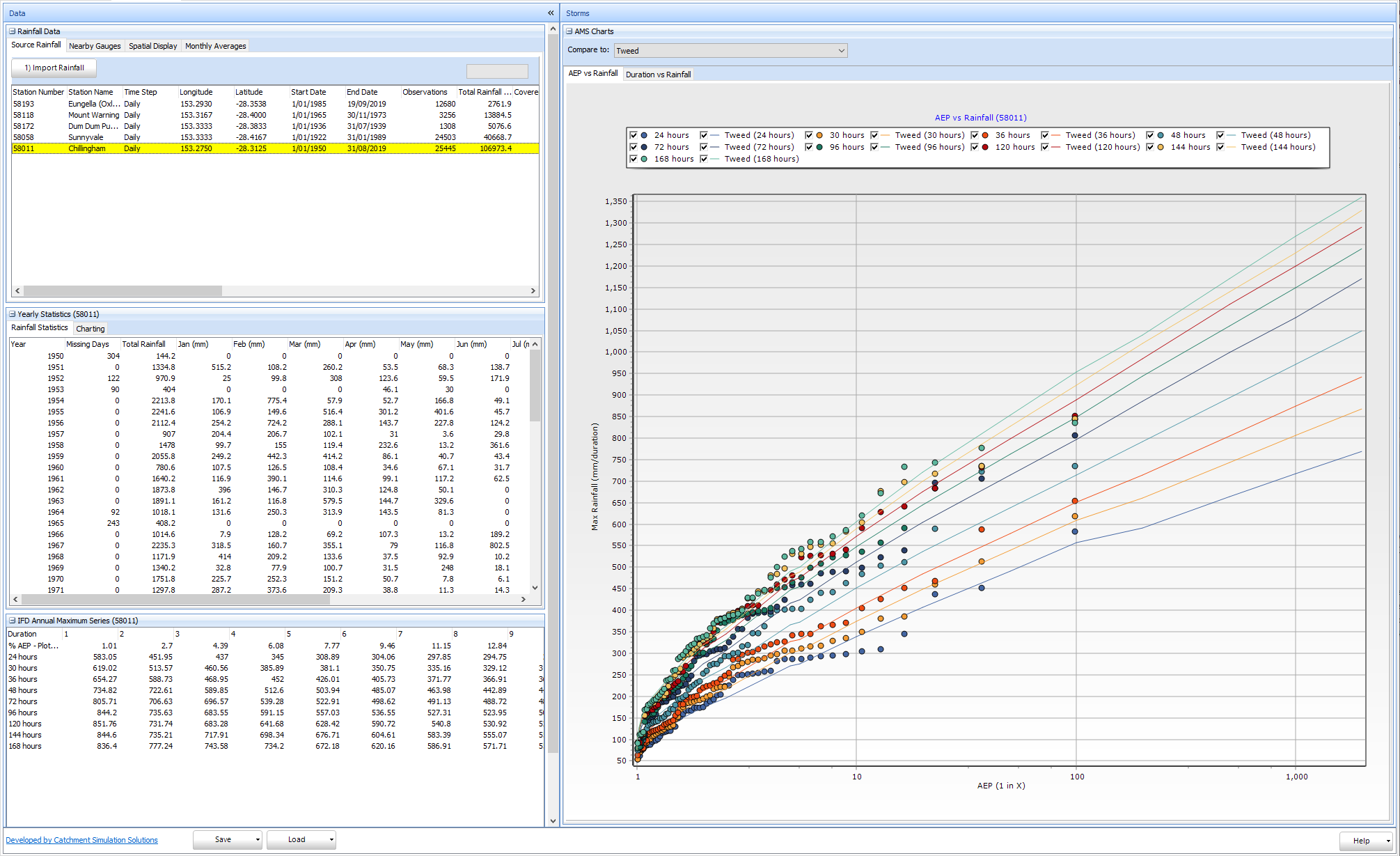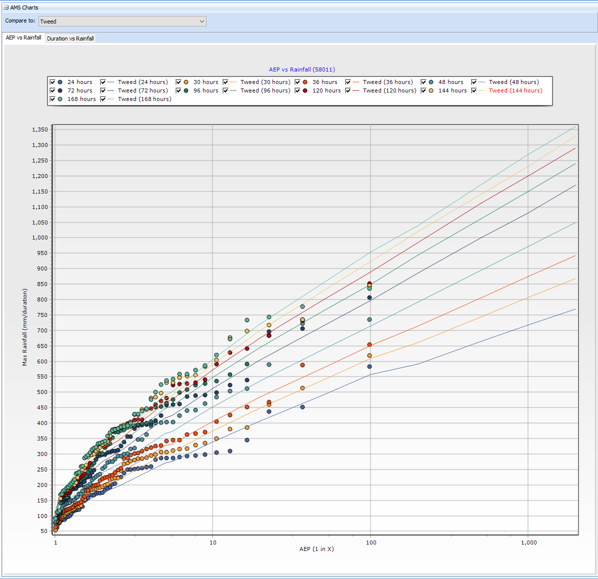 A number of charts are available to help visualise the annual maximum data, their plotting positions and compare them to the IFDs downloaded in the Storm Generator tab. Frequent and Rare IFD datasets will automatically be also shown on these charts.