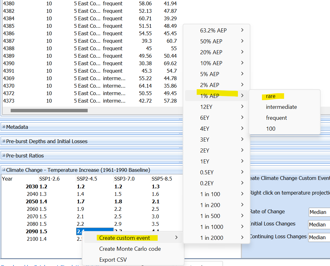a.Add a climate change scenario by navigating to the "Climate Change" panel on the Storm Generator tab. Right-click the 2090 row under the SSP2-4.5 scenario and select 'Create custom event >> 1% AEP >> rare'.