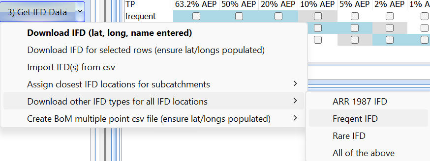 8.You will also need rare and frequent IFD datasets. Click the button '3) Get IFD Data' drop arrow, then 'Download other IFD types for all IFD locations >> Frequent IFD' and then repeat for Rare IFD, in order to get all necessary rainfall data.