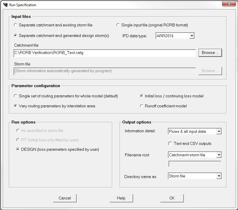 The RORB ARR 2016 configuration tool was used to setup the runs as shown below.