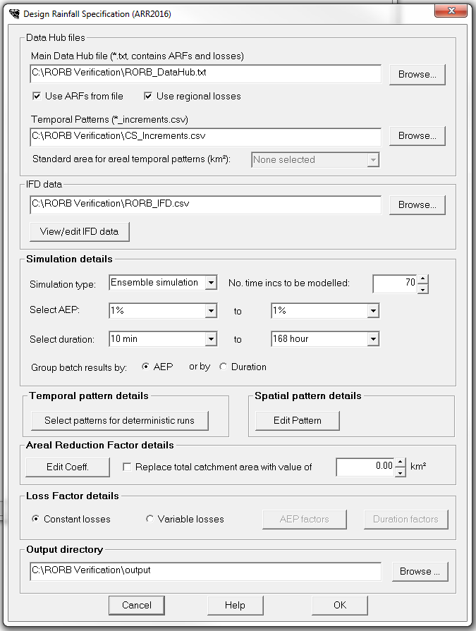 RORB does not analyse the results of the individual storm runs to determine the representative temporal patterns and peak flows for each duration or determine the critical duration. At the time of this verification exercise, RORB did not provide for adjusting the initial loss values in accordance with the median pre-burst data as suggested in the ARR 2016 guidelines (Note, RORB 6.45 now does allow pre-burst modelling using in-built pre-burst temporal patterns). Finally, RORB does not allow for more than one IFD dataset to be used to represent different subcatchments in the project. As such, a fully spatially varying verification could not be undertaken.