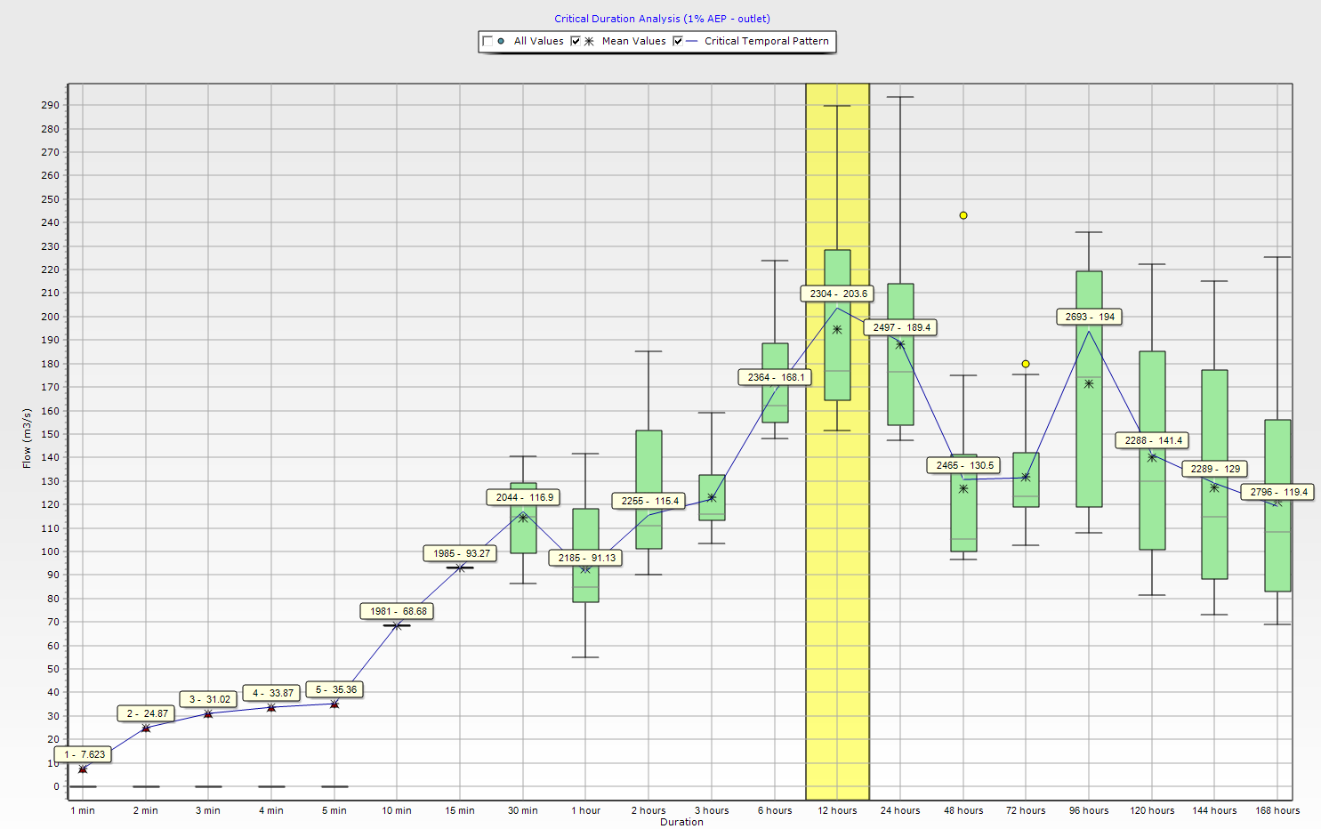 Using this procedure, Storm Injector generates near identical results to RORB. Storm Injector identifies the 12 hour storm as being critical and TP 2304 as being the critical temporal pattern with a peak flow of 203.6 m3/s. This matches the results for TP 23 in the RORB result which is the first TP above the mean for this duration. This verifies that RORB and Storm Injector are calculating the same ARF and applying the temporal patterns in an identical fashion.