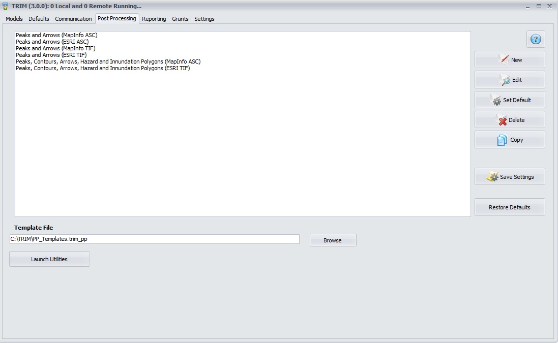 This form allows you to select a default Post Processing template as well as creating new templates from scratch or by copying an existing template. The Template File box shows where the templates are saved. Template sets can be transferred to different users by simply emailing this file. If you ever wish to restore the default templates, simply delete this file.