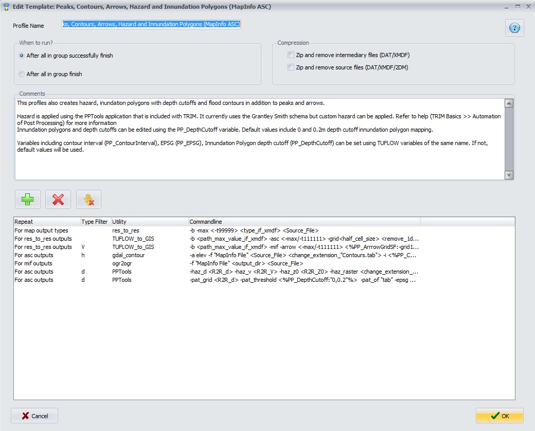The form below appears when editing or creating a template. As an example, we'll describe the the presented Peaks, Contours, Arrows, Hazard and Innundation Polygons (MapInfo ASC)' template below. This profile creates peak results, depth contours, velocity arrows, custom hazard grid and inundation polygons for 2 depth cutoffs.