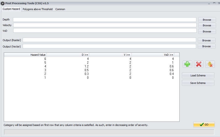 The custom hazard calculator allows a grid of hazard categories to be developed based on V, D and VxD (Z0) results. The grid displays the criteria for each hazard value. It is important that these rows are entered in order of decreasing severity. A cell will be allocated the hazard category for the first row for which any of the criteria are satisfied. The default criteria is based on Grantley Smith's paper 'Delineating hazardous flood conditions to people and property' from the 2015 Floodplain Management Authorities conference (refer Table 1). However, custom profiles can be created, saved and loaded.