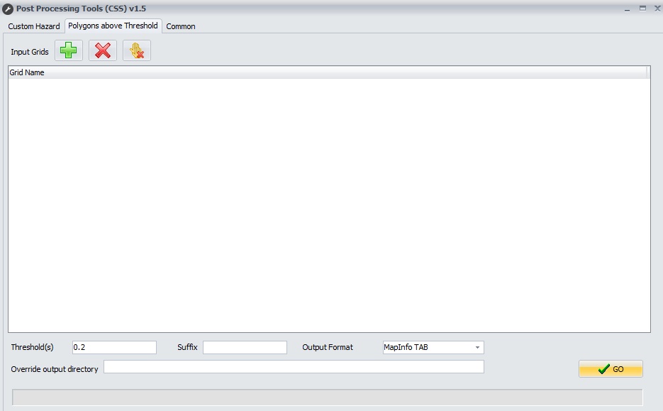 This tool allows one or more grids to be converted to polygons for those values above certain threshold(s). For example, mapping a inundation polygon above a depth of 0.2m. Grids can be added manually using the plus button. One or more threshold can be entered in the Threshold field (multiple depths separated by commas). A suffix can be added to the filenames and the output format can be set.