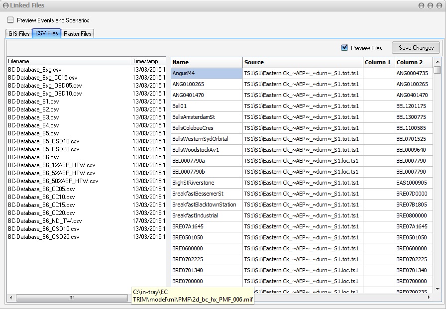 If a simulation has missing or out of date (TAB newer than MID/MIF), then a warning will be generated in the '!!' column. A description of the issue will be shown in the tooltip and the Linked Files form can be displayed by double clicking on the warning icon. This depends on your settings (on by default).