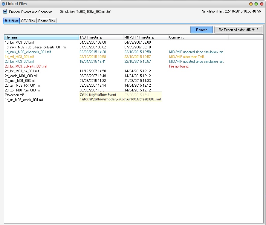 Via the right click menu, all linked GIS, CSV and raster files associated with a simulation can be viewed. The GIS Files tab displays the MapInfo or ArcGIS vector files that are referenced by the simulation. A comments column and row highlighting are indicative of common errors and warnings including: