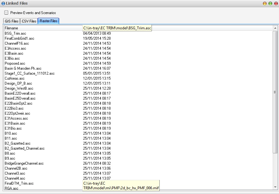 The Raster Files tab shows all the Raster files that are referenced by the simulation. The right click menu allows these files to be opened in text editor, by an associated application or open their folder.