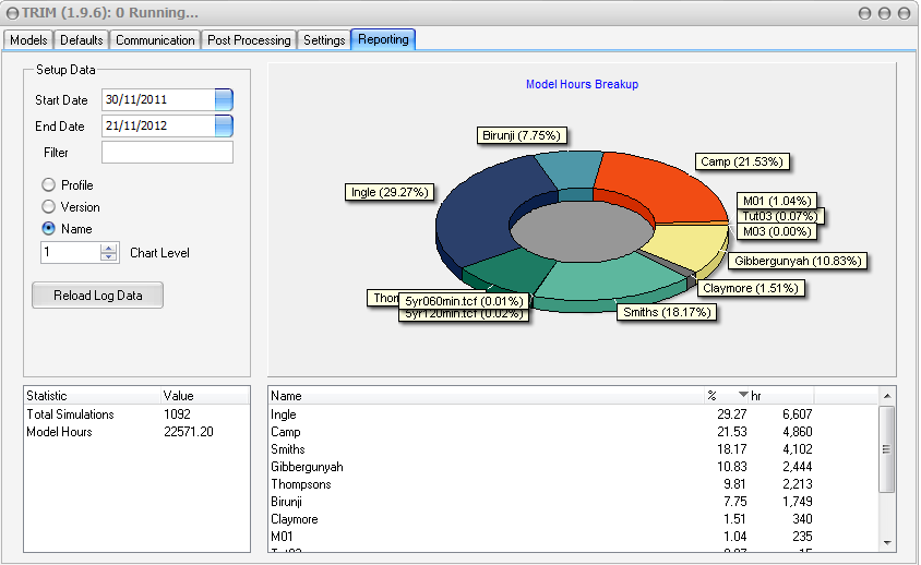 TRIM allows reporting on all simulations run via the software. Reporting can be done based on simulation name, communication profile (user) or TUFLOW version. It can also be filtered by date or text matches. Reporting is only available on simulations run after TRIM 1.9.6 was installed.