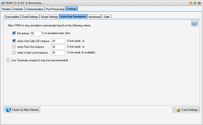 TRIM has the capability to automatically stop simulations. For example, a simulation can be stopped once it is well past the flood peak. This can be configured based on a range of criteria including simulation time, number of wet cells, model out flow and/or water level as shown in the Settings >> Auto-Stop Simulations tab (refer below). This feature is designed to save time by not modelling the full recession limb of the flood. In addition, users do not need to iteratively adjust simulation end times for different events.